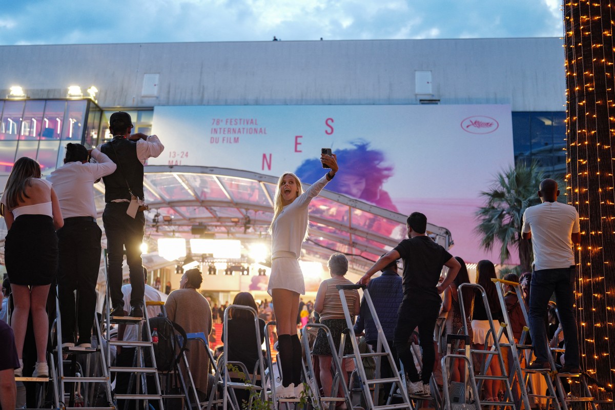 An onlooker takes a selfie atop a step ladder across from the red carpet arrival for the screening of the film "Sirat" outside the Palais de Festival at the 78th edition of the Cannes Film Festival in Cannes, southern France, on May 15, 2025. © Valery Hache / AFP