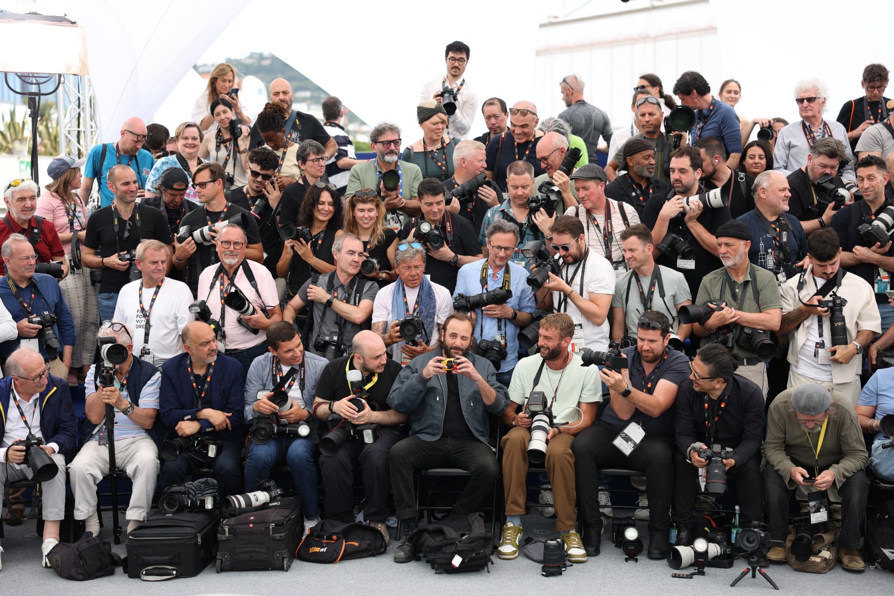 French actor Vincent Macaigne (front row C) sits among photographers during a photocall for the film "Arco", on May 16, 2025. © Sameer Al-Doumy / AFP
