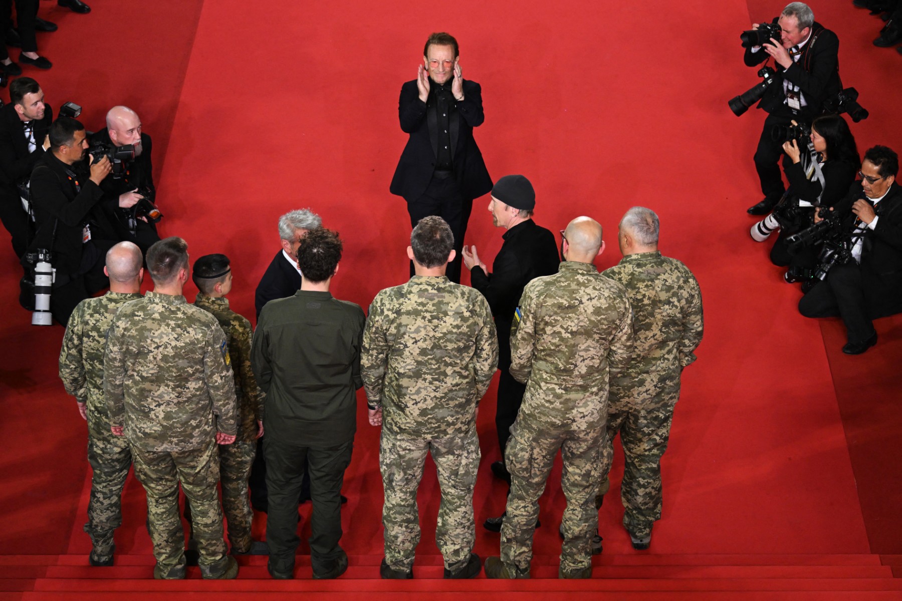 British-Irish musician The Edge (3L), Irish singer-Songwriter and executive producer Bono (C) and US actor, screenwriter, and film director Sean Penn (4R) pose with Ukrainian servicemen as they arrive for the screening of the film "Bono: Stories of Surrender" at the 78th edition of the Cannes Film Festival in Cannes, southern France, on May 16, 2025. © Bertrand Guay / AFP