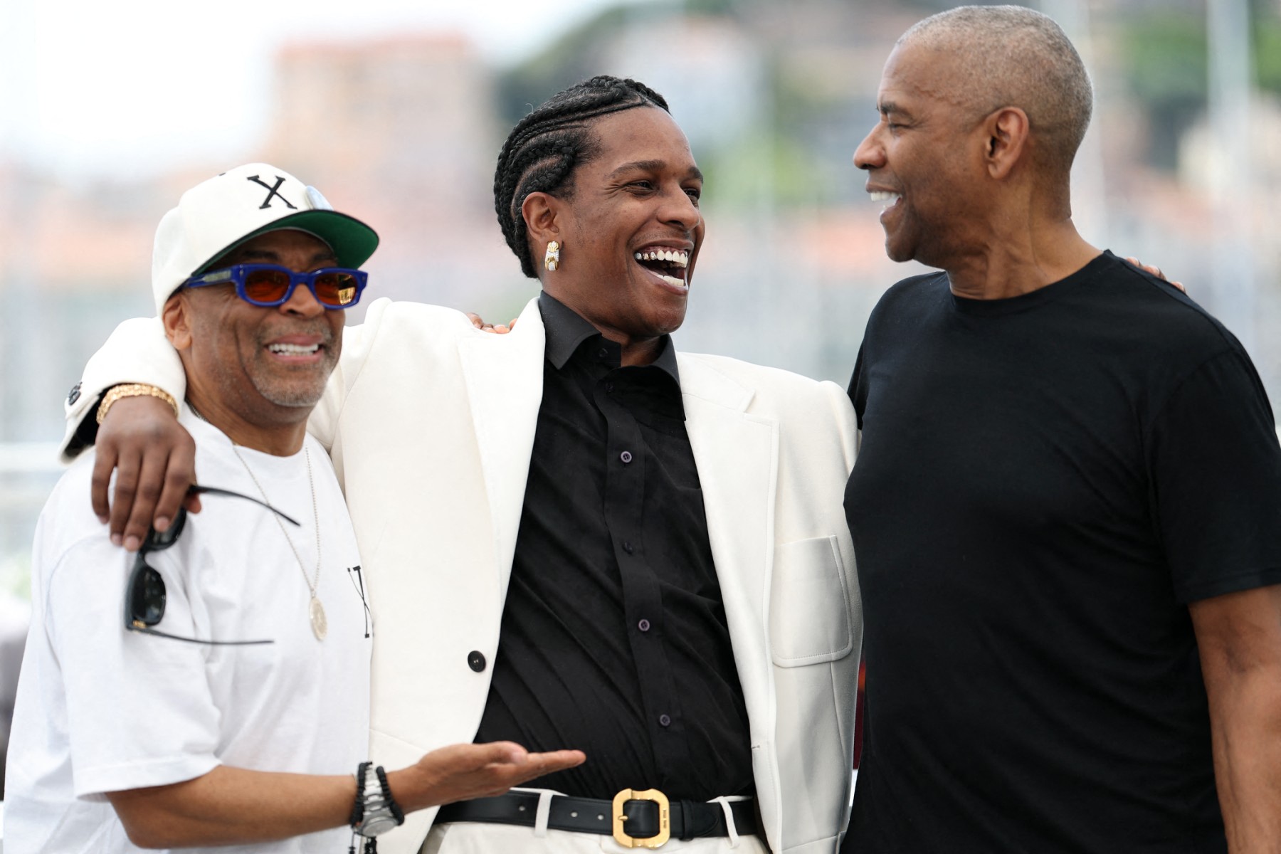 • 3rd photo : US director and executive producer Spike Lee, US actor and singer ASAP Rocky and US actor Denzel Washington during a photocall for the film "Highest 2 Lowest", on May 19, 2025. © Sameer Al-Doumy / AFP