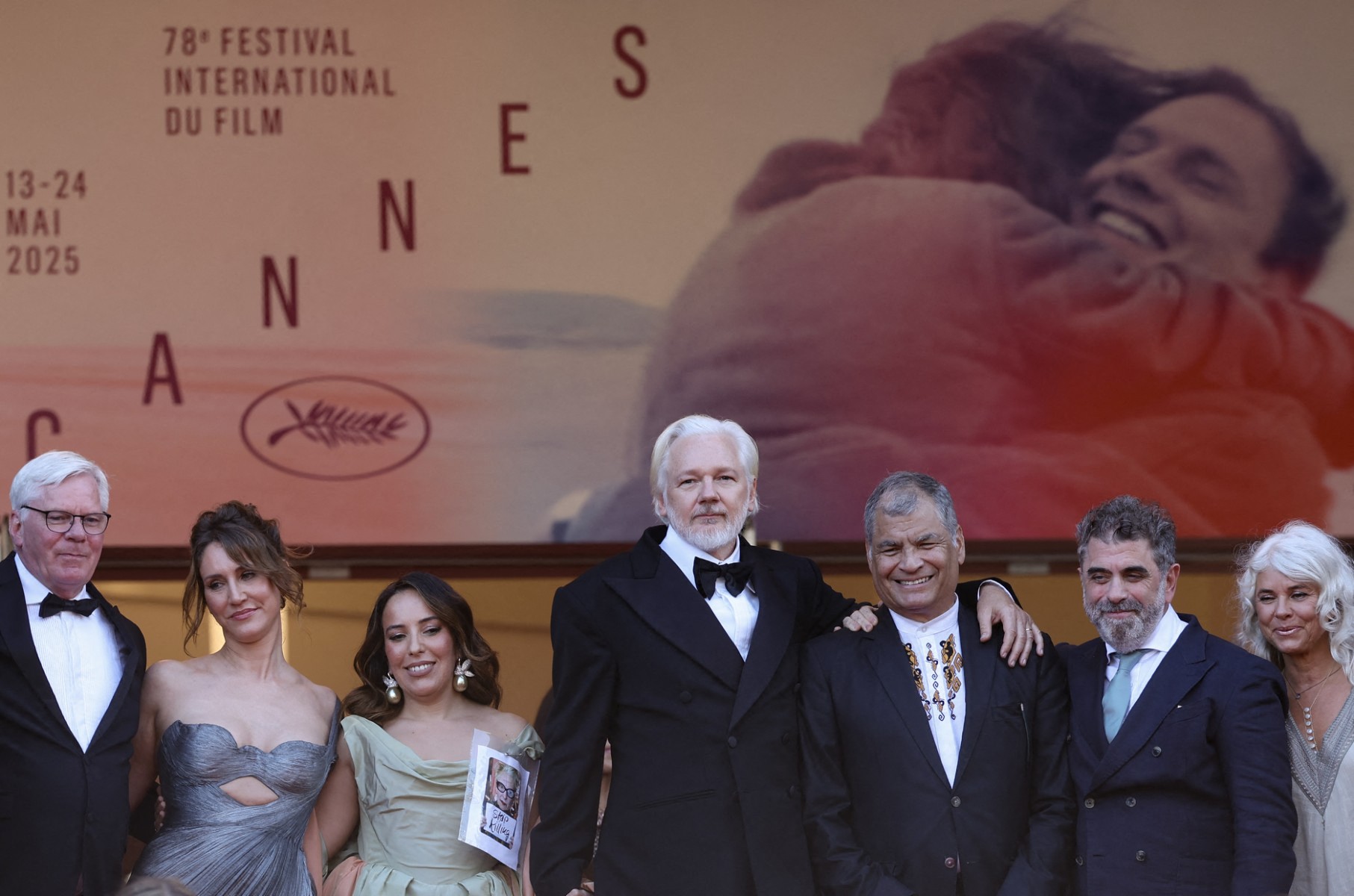 (From 2L) British-French producer Kathleen Fournier, Swedish-Spanish lawyer Stella Assange, Australian publisher, activist Julian Assange, former Ecuador president Rafael Correa arrive for the screening of the film "The Six Billion Dollar Man", on May 21, 2025. © Sameer Al-Doumy / AFP