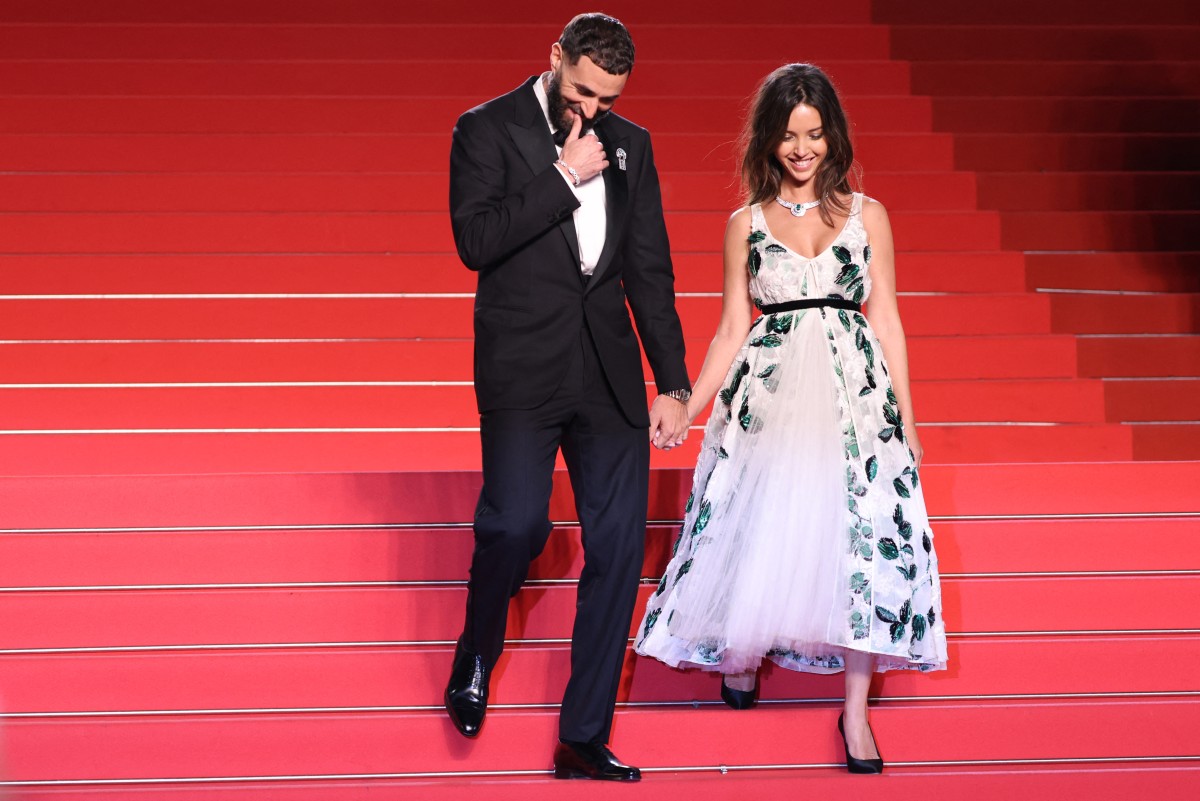 Ittihad's French forward #09 Karim Benzema (L) and Algerian-French actress Lyna Khoudri leave after the screening of the film "13 jours, 13 nuits" (13 Days, 13 Nights) at the 78th edition of the Cannes Film Festival in Cannes, southern France, on May 23, 2025. © Sameer Al-Doumy / AFP