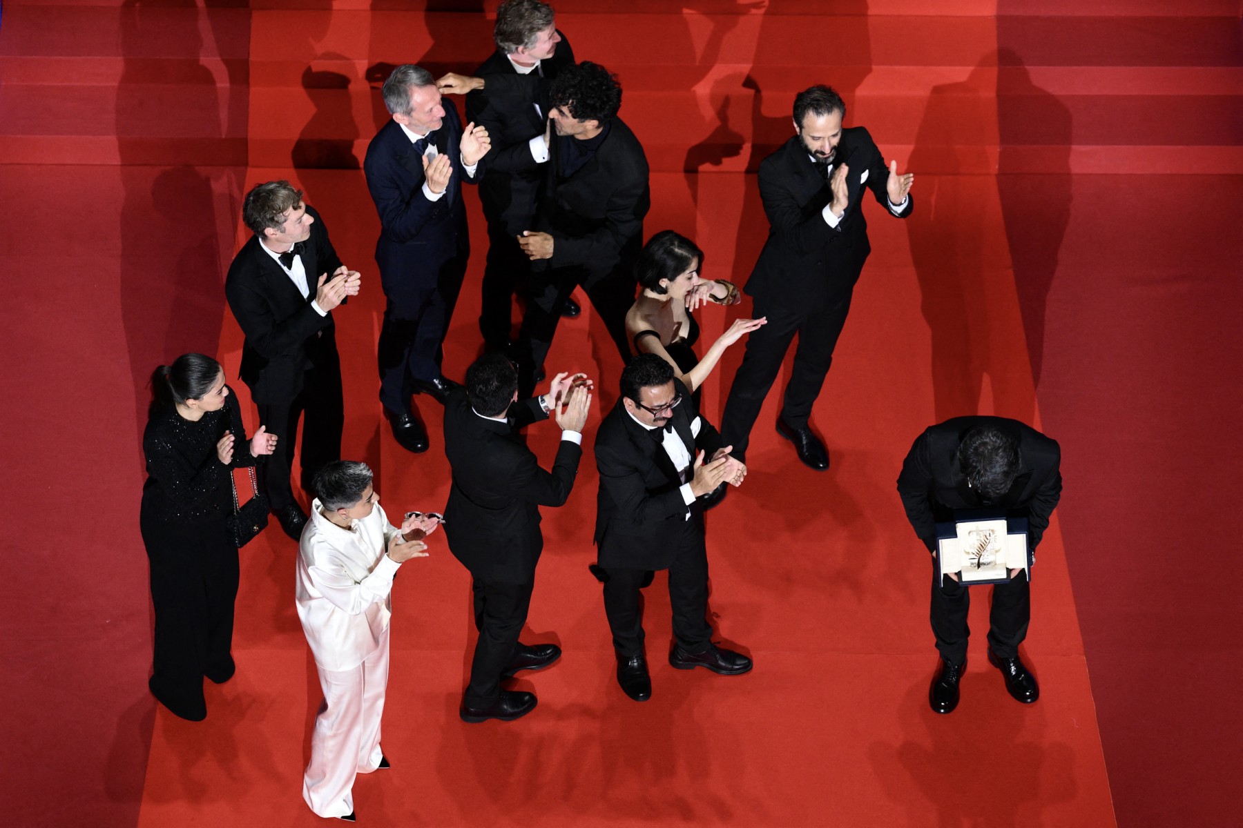 • 3rd photo : (Front from L) Iraqi director Hasan Hadi and winner the Camera d'Or prize for the film "The President's cake", Iranian director and screenwriter and producer Jafar Panahi and Iranian actress Hadis Pakbaten celebrate on stage at the end of the closing ceremony, on May 24, 2025. © Valery Hache / AFP