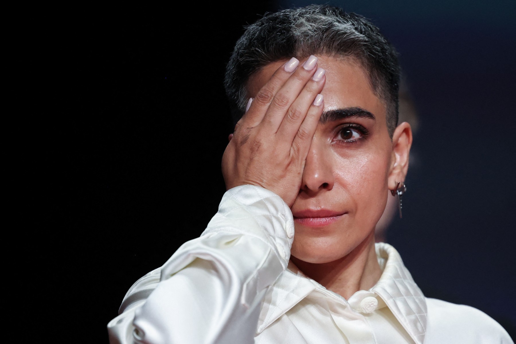 • 1st photo : Iranian actress Maryam Afsharimovahed gestures on stage after Iranian director and screenwriter and producer Jafar Panahi won the Palme d'Or for the film "Un simple accident" (A Simple Accident) on May 24, 2025. © Valery Hache / AFP