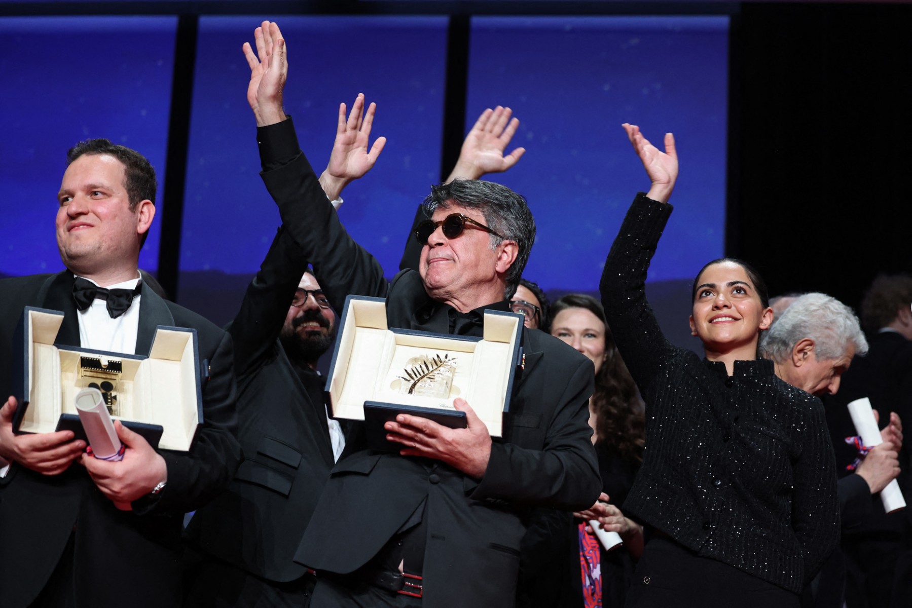 • 2nd photo : (From L) Iranian actress Hadis Pakbaten, Iranian actress Maryam Afsharimovahed, Iranian actor Majid Panahi react on stage as Iranian director and screenwriter and producer Jafar Panahi delivers a speech after winning the Palme d'Or for the film "Un simple accident" on May 24, 2025. © Valery Hache / AFP