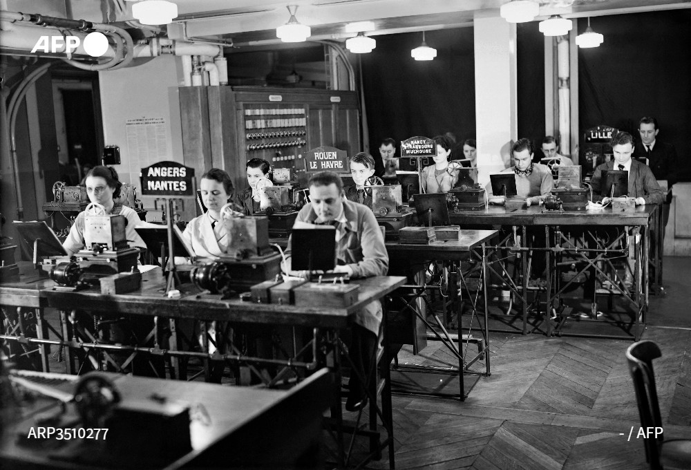 Foto tirada na década de 1930 em Paris, na Place de la Bourse, na sede da agência de notícias Havas, mostra funcionários da redação transmitindo notícias para os escritórios da agência em diferentes regiões da França. © AFP