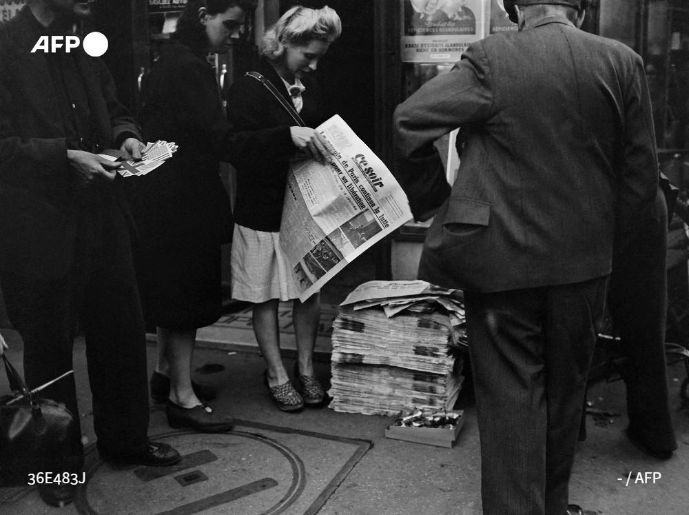 Parisienses compram jornais em agosto de 1944, durante a batalha pela libertação de Paris, durante a Segunda Guerra Mundial. Há 80 anos, em 20 de agosto de 1944, um pequeno grupo de combatentes da Resistência tomou o Office Français d'Information (OFI), criado pelo regime de Vichy, e deu origem à AFP, cinco dias antes da libertação de Paris. © AFP